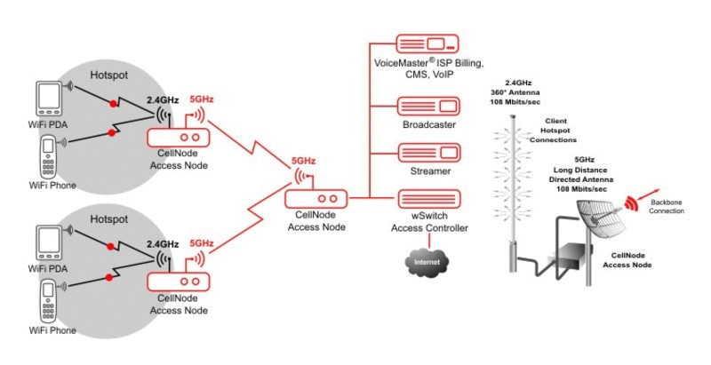 CellNode Wireless Management System enables service providers to build and operate wireless networks with extended coverage (e.g. networks that cover university campuses, resort areas, whole cities, or metropolitan areas). Such wireless networks provide the perfect infrastructure for offering mobile Internet access, VoIP telephony, and IPTV services to subscribers. The CellNode Wireless Management System utilizes the 2.4Ghz and the 5Ghz WiFi bands and is compatible with the 802.11 a/b/g/n/ac standards. The system provides centralized management, monitoring and provisioning of a network of wireless CellNodes. It also performs roaming between network nodes, flood and broadcast prevention, and billing for ISP sessions and VoIP calls.